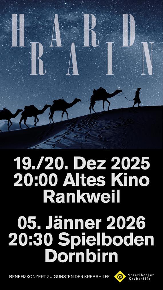Unter dem Motto „HARD RAIN“ gehen am 19. und 20. Dezember 2025 sowie am 5. Jänner 2026 traditionell die Benefizkonzerte zugunsten der Österreichischen Krebshilfe Vorarlberg im Alten Kino Rankweil und im Spielboden Dornbirn über die Bühne. Auch diesmal geben sich wieder die bekanntesten Künstler:innen, die das Ländle zu bieten hat, die Ehre.